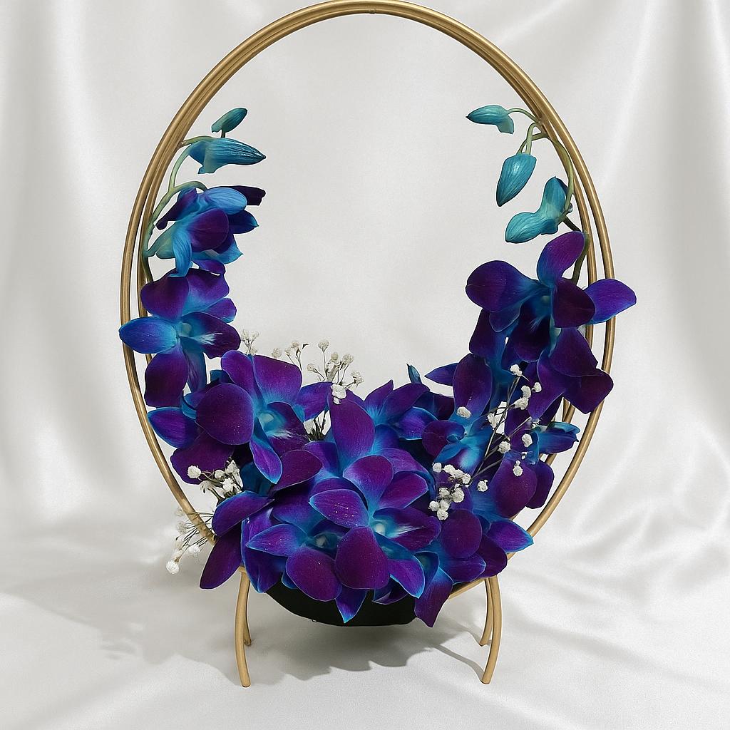 A hand-tied bouquet of pastel and bright blooms including lilies, chrysanthemums, and filler flowers wrapped in soft pink and blue sheets—pure elegance in floral form.