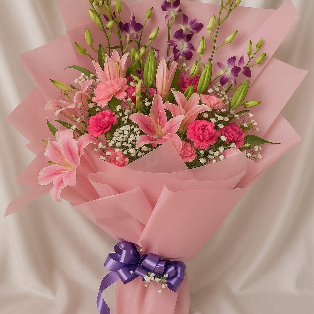 Bring a burst of color and happiness with our Radiant Pink Bliss Bouquet. Featuring a gorgeous blend of pink Asiatic lilies, carnations, orchids, and delicate white gypsophila, this hand-tied bouquet is elegantly wrapped in blush pink paper with a purple satin ribbon. A perfect gift for birthdays, anniversaries, or simply to spread joy.